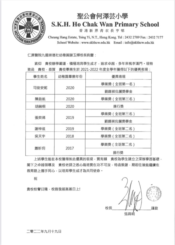友校特意來信恭賀本校舊生於2021至2022學年間喜獲佳績。就此,本校在此恭賀喜獲佳績的舊生們,盼望各位能繼續努力。而本校亦會繼續抱持讓孩子開開心心地學習快快樂樂地成長的教學宗旨,以愛、尊重及關懷的態度,與家長攜手合作培育幼兒。